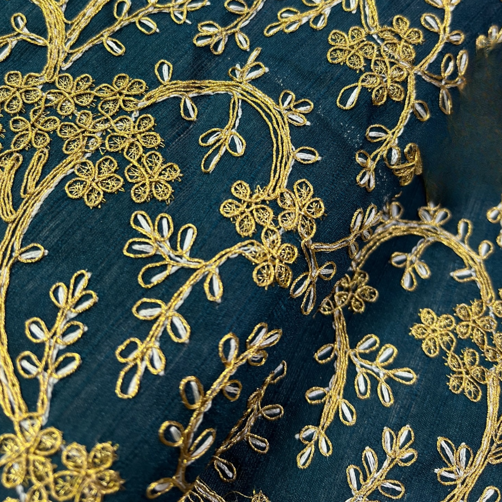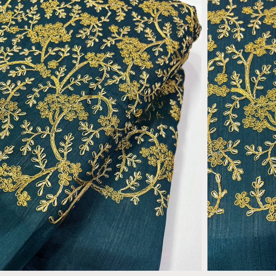 Diese wunderschöne Dupion-Rohseide in kräftigem Petrol besticht durch ihren natürlichen Glanz, ihre fein strukturierte Oberfläche und eine kunstvoll eingearbeitete Goldstickerei. Die Kombination aus leichtem Stand und edlem Schimmer verleiht dem Stoff eine exklusive Wirkung – perfekt für festliche Kleidung, Sari-Blusen, Accessoires oder edle Deko.