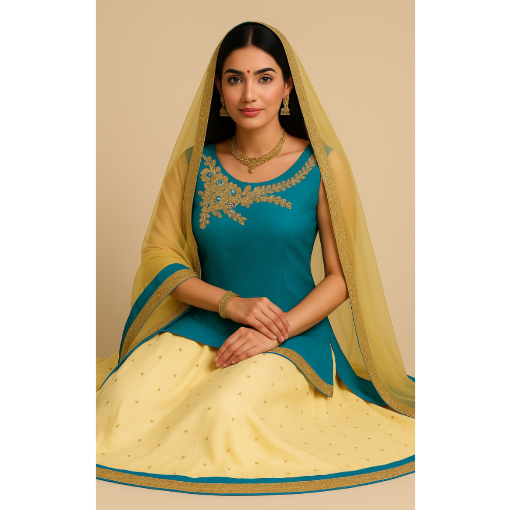 Sehr eleganter Lehenga Choli in Beige & Türkis – tragfertig genäht